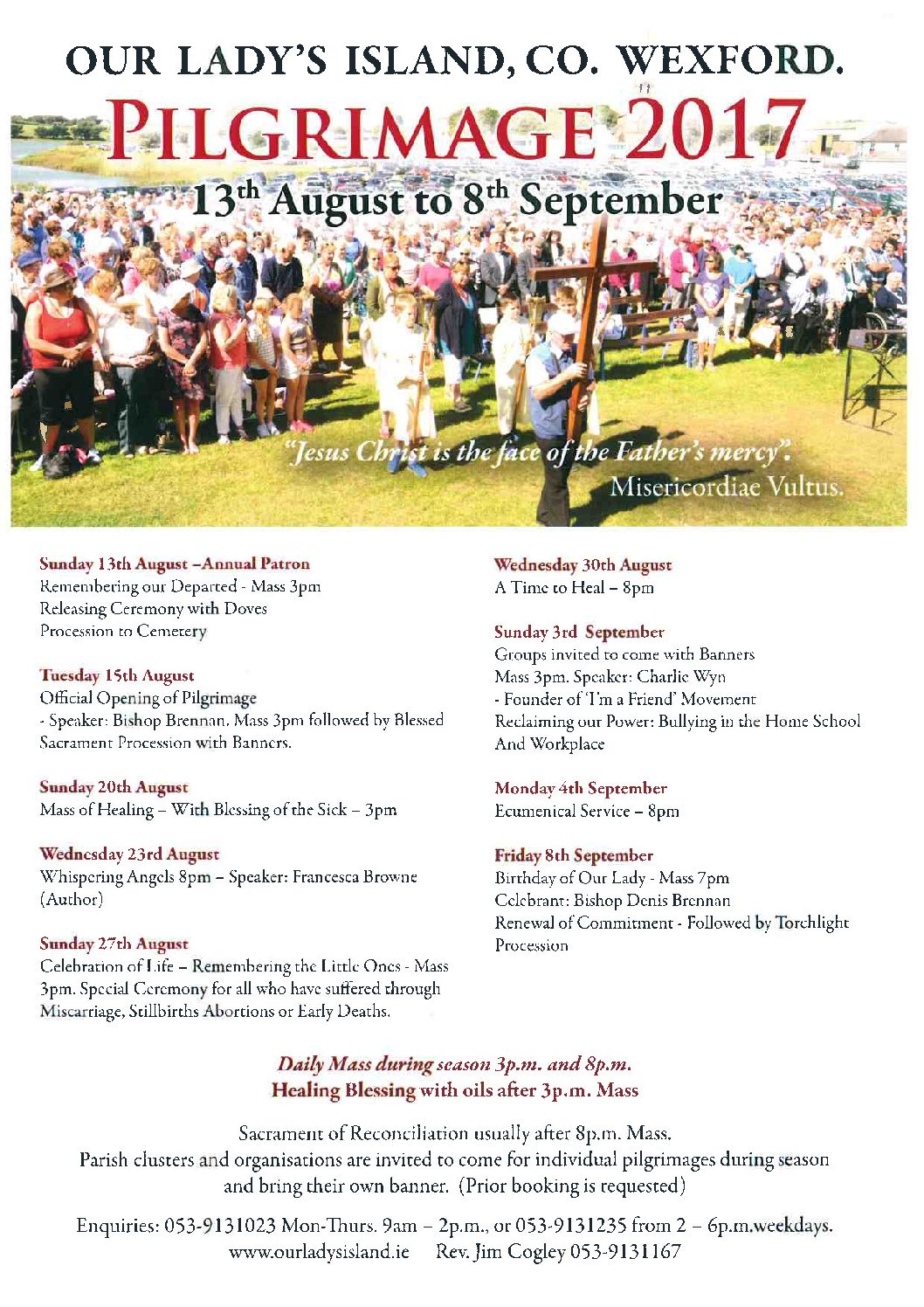 Our Lady’s Island Pilgrimage takes place from 15th August to 8th September each year.Tuesday 15th AugustOfficial Opening of Pilgrimage Speaker: Bishop BrennanMass 3pm followed by Blessed Sacrament Procession with Banners. Saturday 19th AugustCombating the effects of bullying in the Home School And WorkplaceMass 3pm. Speaker: Charlie Wyn – Founder of ‘I’m a Friend’ Movement Sunday 20th AugustMass of Healing – […]